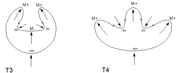 Fig. 11. The symmetry-analysis given at the beginning of this paper describes a process-structure for the indentation that is very subtle, as shown: there is a flattening of the lowest region of the indentation due to the fact that the downward arrows, within the indentation, are countered by an upward arrow, which is within the body of the shape and terminates at the M- extremum. This latter process is an example of what our Semantic Interpretation Rule calls internal resistance. To see what happens when one continues a process at a M- extremum, let us continue the M- process upward, in the left-hand shape. At some point, the process will burst out and create the protrusion shown at the top of the right-hand shape. | back to text | ![]() |