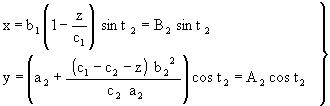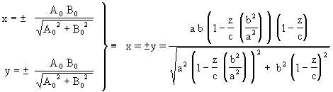 In the previous expressions it can be observed that A1=A2=A0 and B1=B2=B0, these coeficients depending on the paramenter z. Thus the system formed with the four previous equations will lead to the loci of points belonging to the plane curves in accordance with the solution shown below (32), such that the intersection of such plane curves by whatever plane perpendicular to the Z axis gives rise to the four common points of the two ellipses located in the same cutting plane.