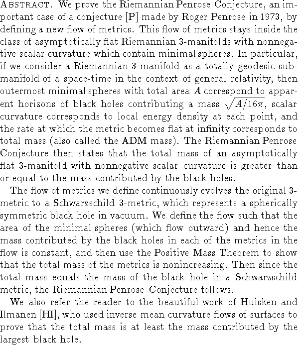 [HI], who used inverse mean curvature flows of surfaces to prove