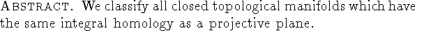 We classify all closed topological manifolds which have the same integral homology as a projective plane.