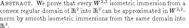 We prove that every $W^{2,2}$ isometric immersion from a convex regular domain of ${\mathbb R}^2$ into ${\mathbb R}^3$ can be approximated in $W^{2,2}$-norm by smooth isometric immersions from the same domain into ${\mathbb R}^3$.