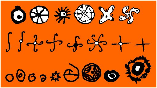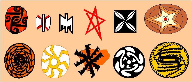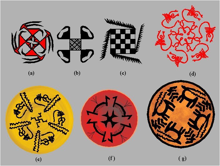 Examples of antisymmetry rosettes with the antisymmetry group D8/C8, that in the classical theory of symmetry are treated as rosettes with the symmetry group C8 (8) (Hajji Mohammed, around 5000 B.C.). |