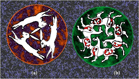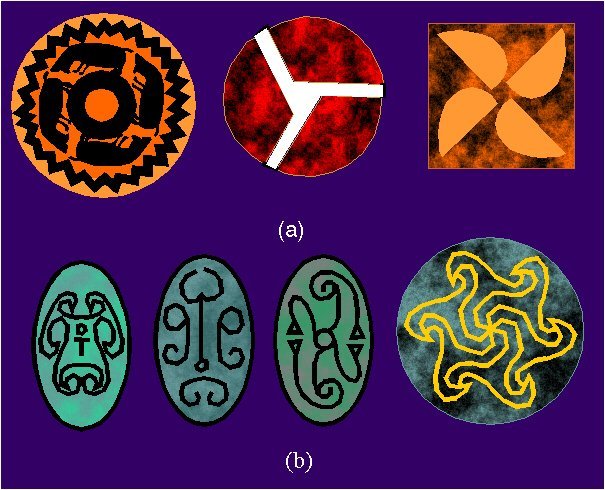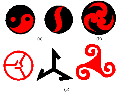 Variations of the (a) Chinese symbol "yang-yin" with the symmetry group C2 (2) and (b) the triquetra motif with the symmetry group C3 (3). |