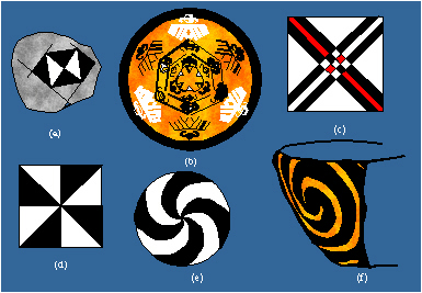 Antisymmetry rosettes in Neolithic ornamental art: (a) D4/D2, Danilo, Yugoslavia, about 3500 B.C.; (b) D6/D3, Near East; (c) D4/D2, Near East; (d) D4/C4, Middle East; (e) C8/C4, Middle East; (f) C4/C2, Dimini, Greece. |