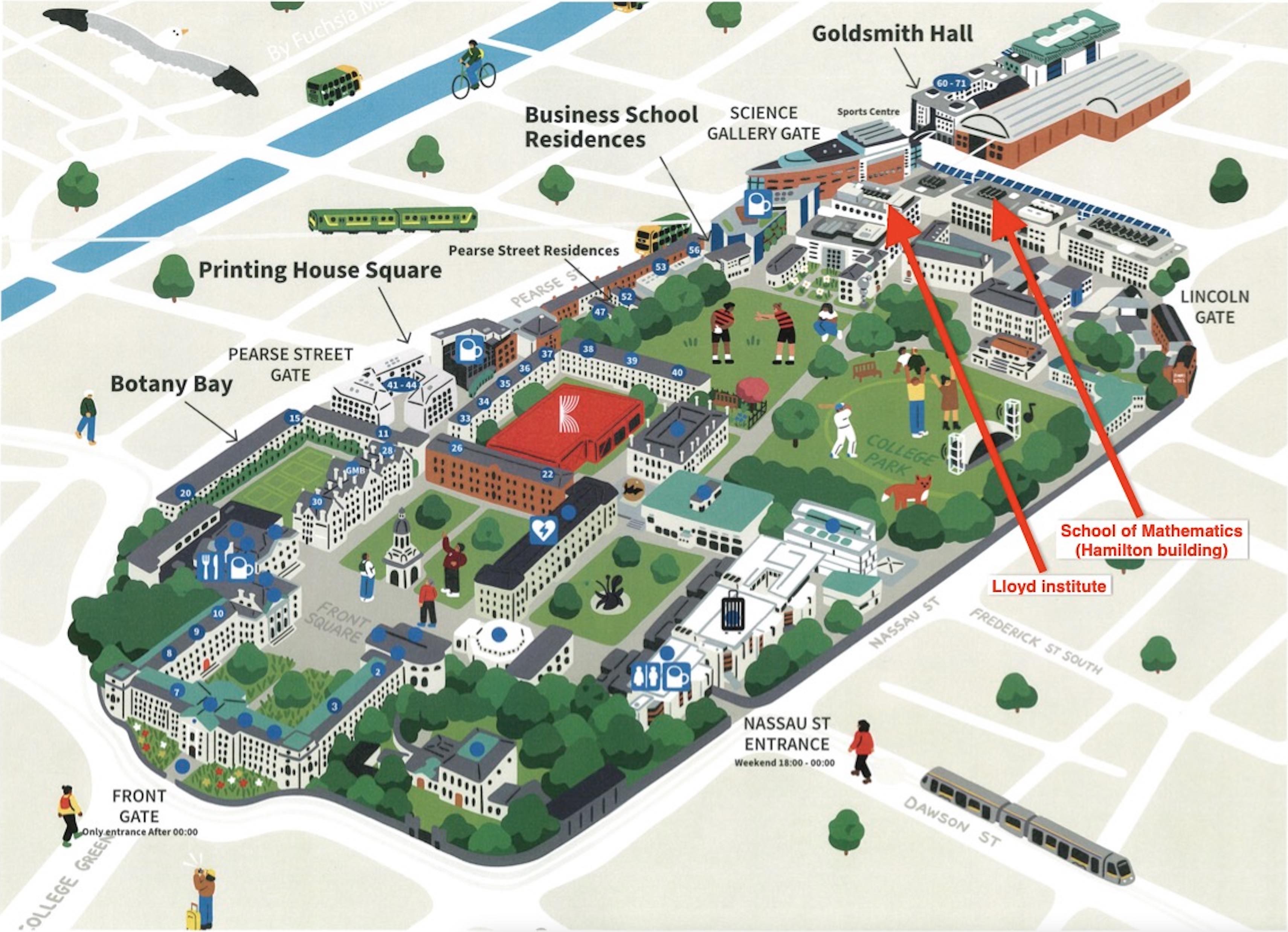 The High-performance Computing group and facilities are located on the 2nd floor in the Lloyd institute near the north-east entrance to TCD's main campus. The M.Sc. course is implemented by the School of Mathematics located nearby in the Hamilton building.