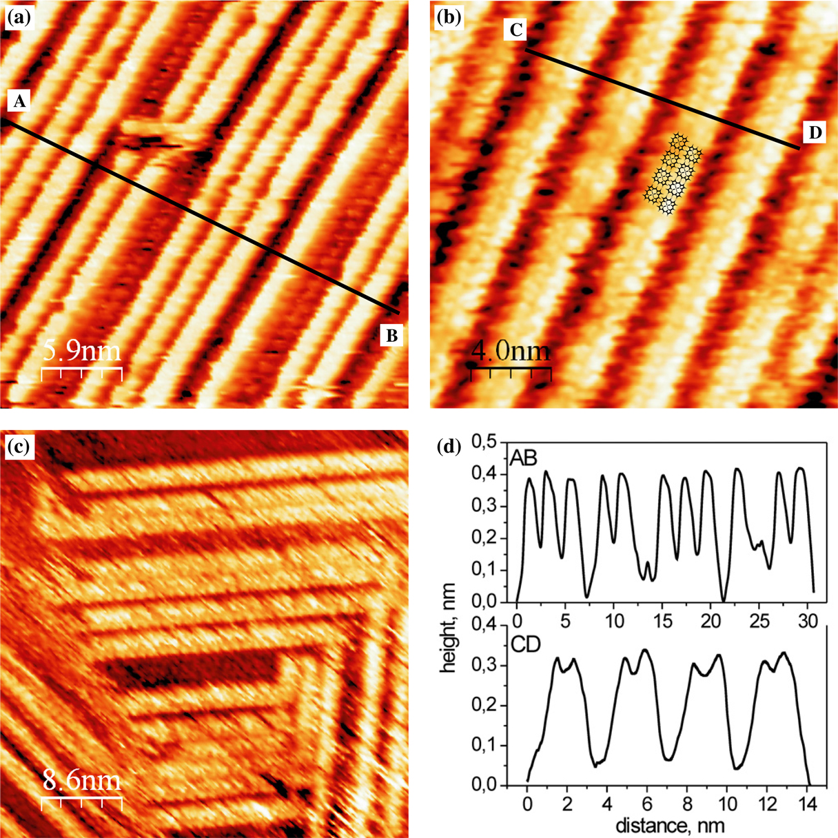 As the coverage is further increased, the nanolines grow together laterally, and at 1.8 ML the molecules are seen to form lines with an average width of 5.0 ± 0.1 nm, with dark rows between them corresponding to a single missing molecular row (Figure 4.2). When the coverage finally reaches 2 ML, the closed hexagonal packing is restored, however the unit cell is approximately 4% larger than that of the first layer. This indicates that the molecule–substrate interaction experienced by the first layer is enough to accommodate this strain. Since it experiences less of an effect from the substrate, the second layer undergoes a lateral relaxation compared to the first layer, and this relaxation causes some of the molecules to be displaced out of plane, resulting in a 5.0 nm modulation of the apparent height, corresponding to the filling of the missing rows in going from 1.8 ML to 2.0 ML.