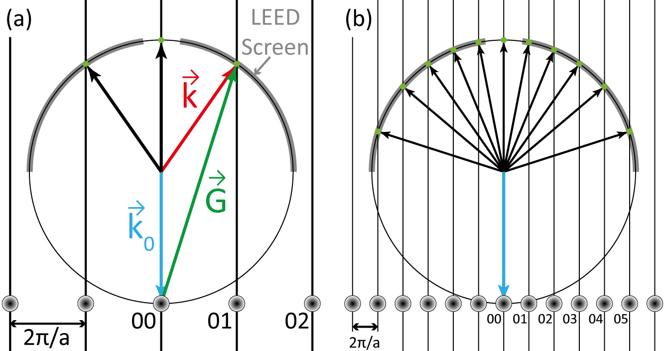 The Ewald sphere illustrates the points of constructive interference formed by the incident and diffracted electron waves. The upper half of the sphere can be considered as the hemispherical fluorescent screen of the LEED apparatus, and from Figure 2.5b it is clear how a higher kinetic energy leads to more LEED spots visible on the screen.